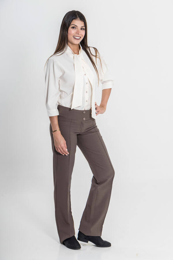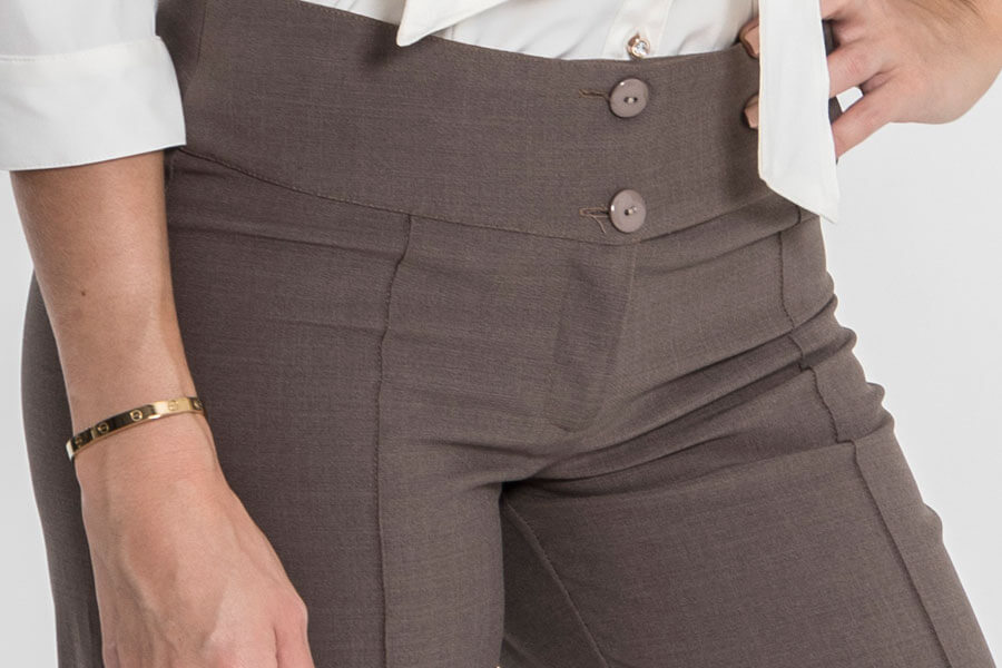 Pantalón ejecutivo de bota recta con pretina anatómica prolongada de cuatro botones.